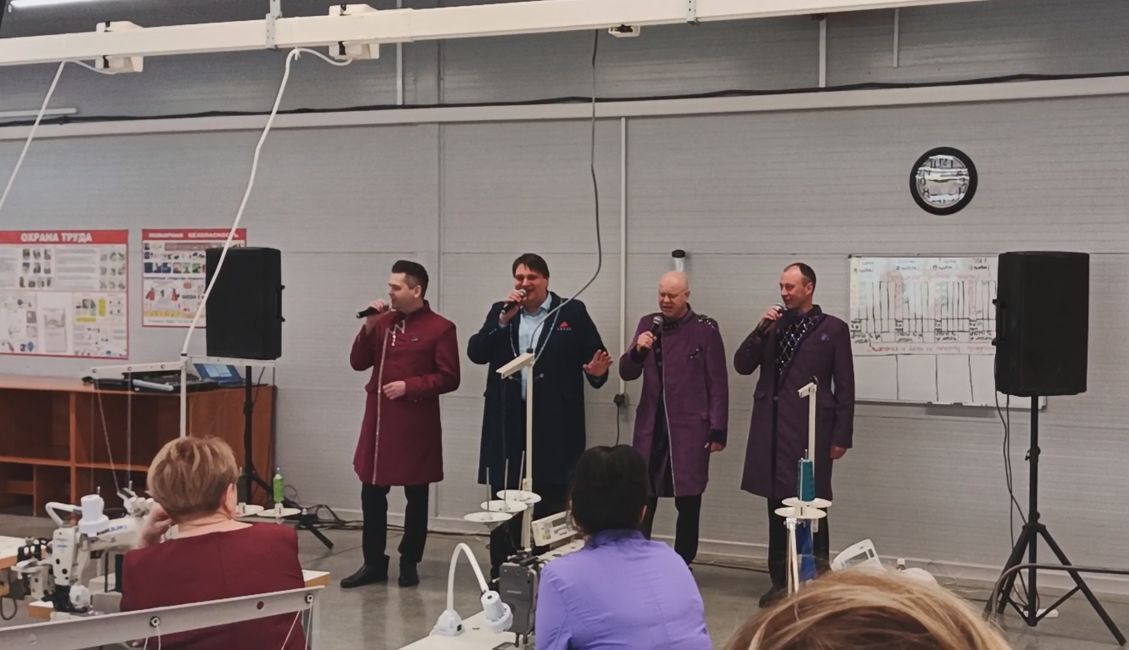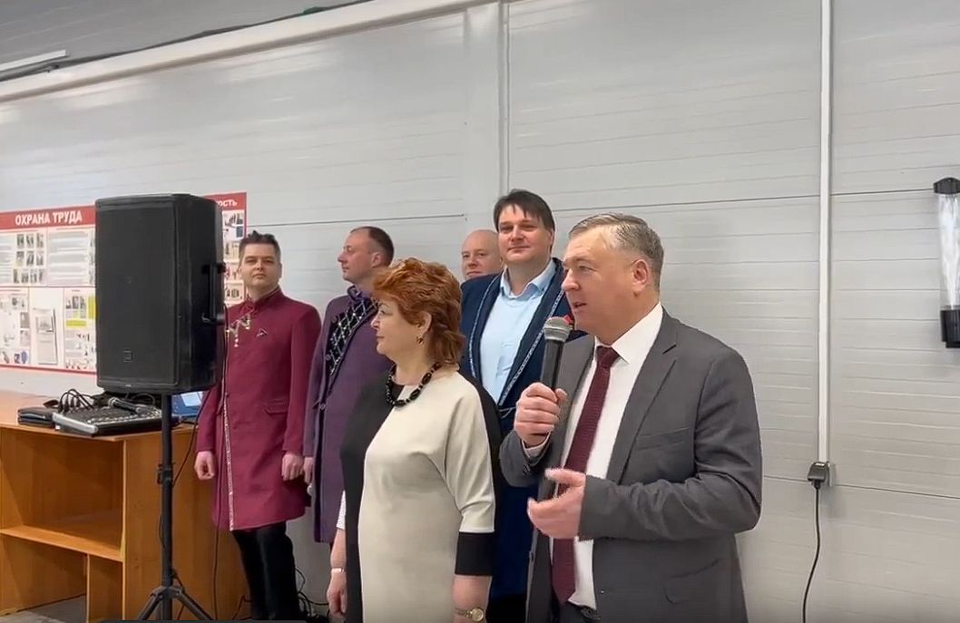 06.03.2026 Глава муниципального образования "Починковский муниципальный округ" Смоленской области Александр Владимирович Голуб и директор Починковской швейной фабрики Анна Андреевна Зайцева поздравили женский коллектив фабрики с Международным женским днем. Праздничный концерт прошел при участии вокального ансамбля «Славянское братство».